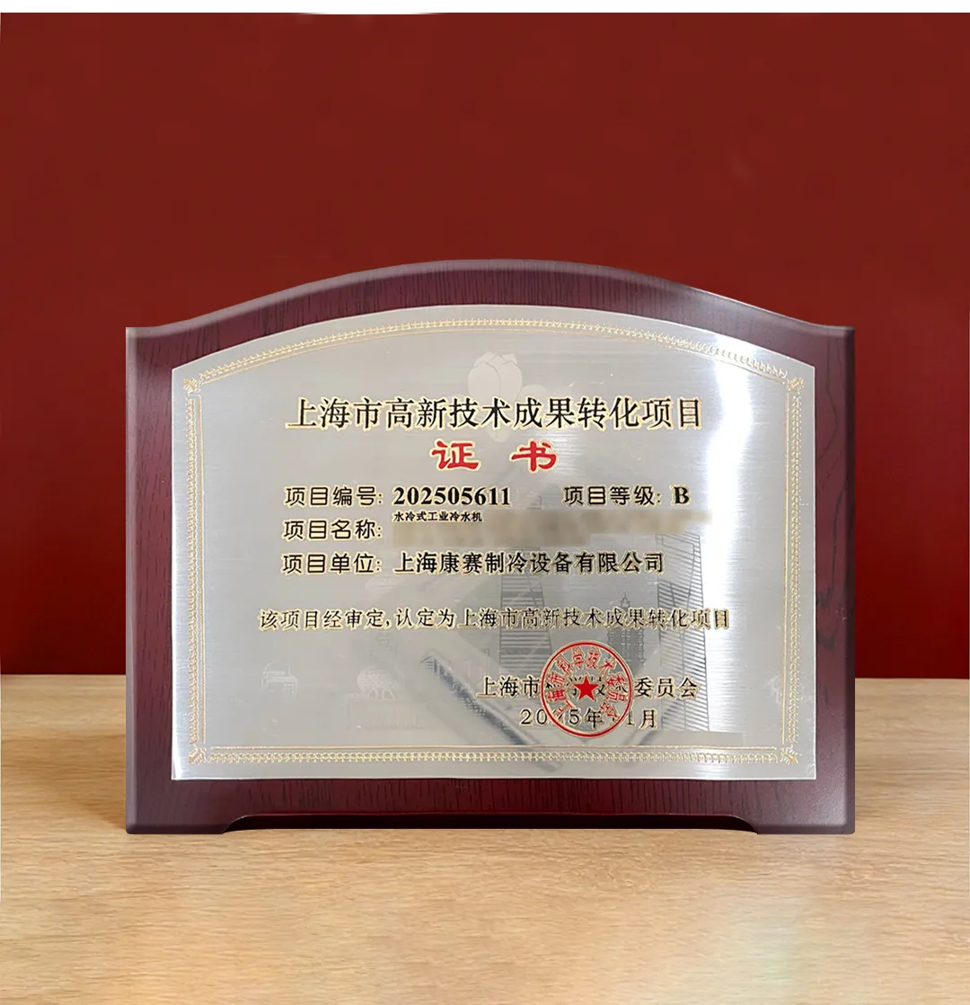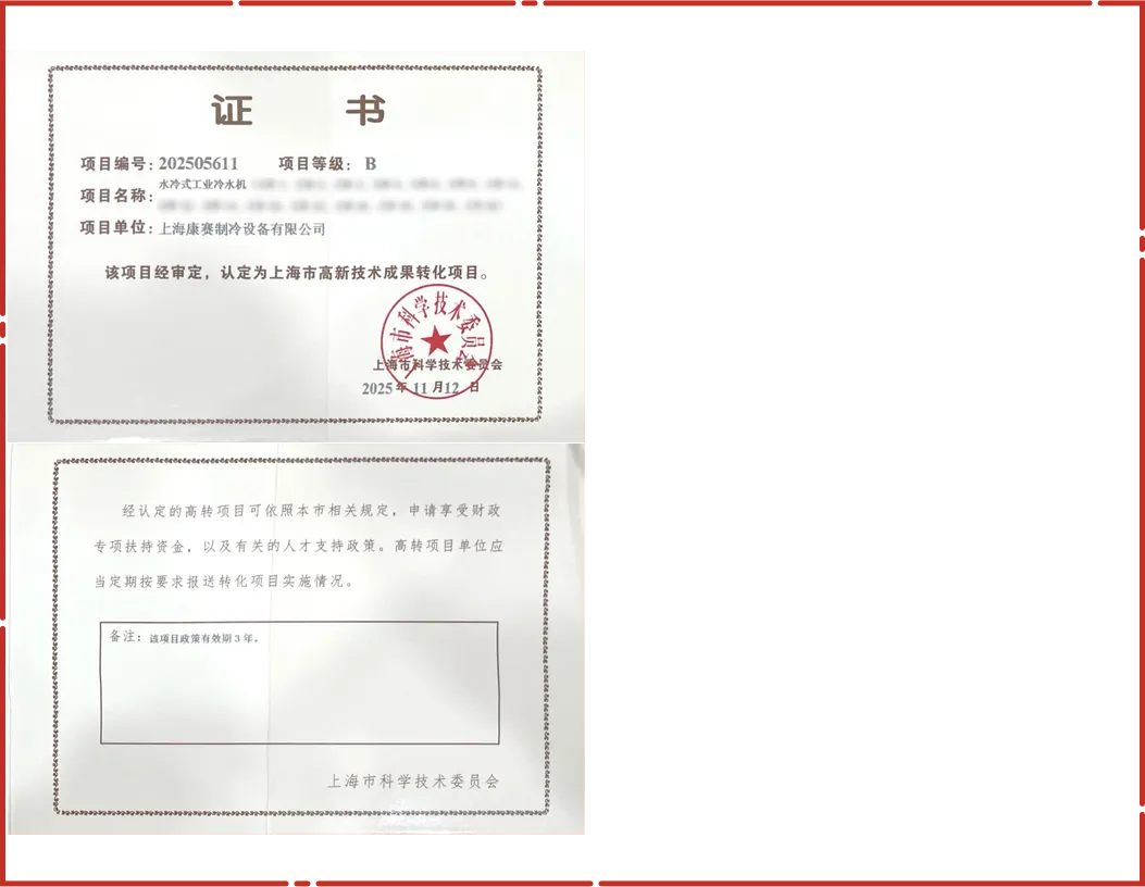 Recently, KANSA Refrigeration’s independently developed“Water‑Cooled Industrial Chiller” (Project No.: 202505611)stood out among numerous projects and successfully obtained the “Shanghai High‑Tech Achievement Transformation Project Certificate” issued by the Shanghai Municipal Science and Technology Commission.